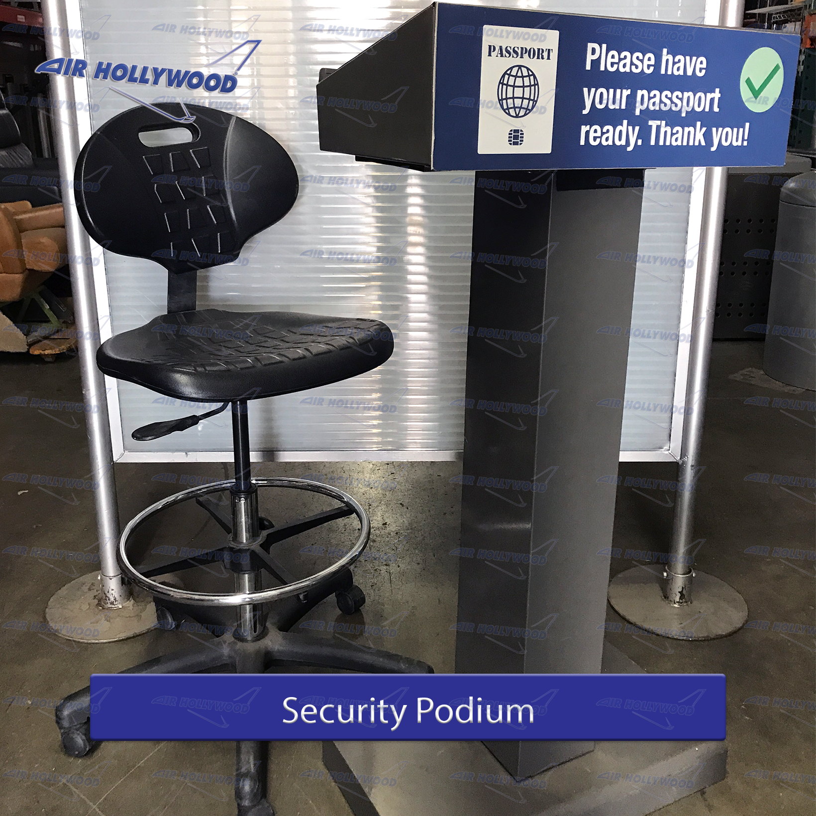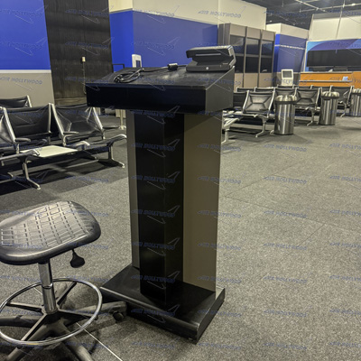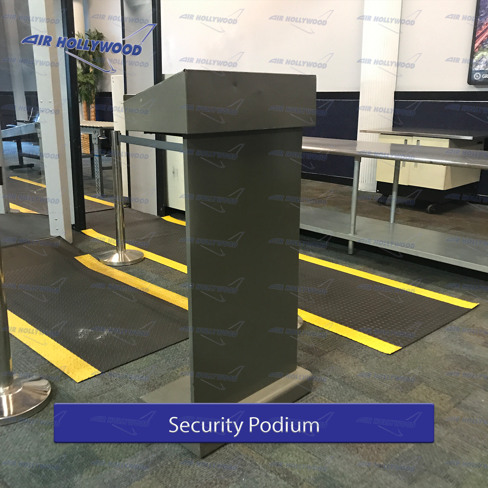 Black Metal security podium with removeable grey front, DHS logo & blacklight ID reader. 48″h x 23″w x 14″ d. 3 Available.